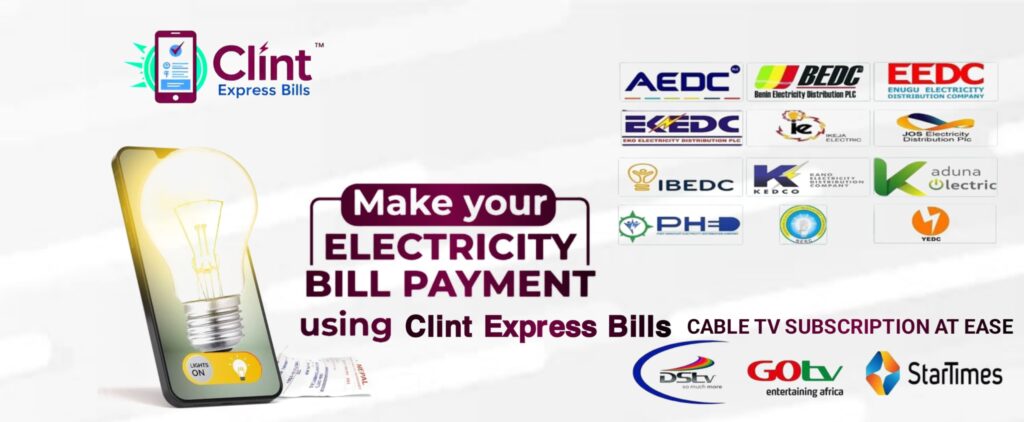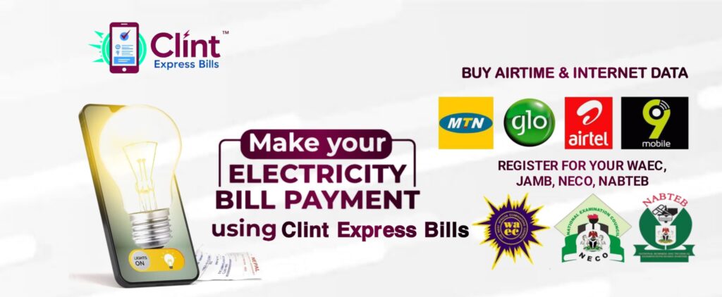 Make fast Bill payment at anytime Get Amazing Deal Pay Bills Get Started Feature Products Airtime & Data PurchaseTop up your phone or purchase data bundles instantly for all major networks, ensuring you stay connected at all times. Available networks include:MTNAirtelGlo9mobile Electricity Bill PaymentStay connected with uninterrupted power by paying your electricity bills seamlessly. Our platform supports payments for: (IKEDC), (EKEDC), (AEDC), (PHEDC), (KEDCO), (EEDC), (JEDC), (IBEDC), (BEDC) Result Checker ServicesEasily purchase and retrieve result checker PINs for major national exams, ensuring quick access to your results. Supported exam bodies:WAEC (West African Examinations Council)NECO (National Examinations Council)JAMB (Joint Admissions and Matriculation Board)NABTEC. e.t.c. Why Choose ClintExpress Bills Pay BillsEnjoy seamless bill payments for airtime, data, electricity, cable TV, Bulk Sms and more—all in one place. Secure PaymentFast, secure, and hassle-free transactions with multiple payment options tailored for your convenience. Pay with Bank TransferMake payments easily via bank transfer with instant confirmation and zero stress. 24/7 Customer SupportOur dedicated support team is always available to assist you anytime, anywhere. Download our Mobile App Top up Airtime, data, Cables and other payments in quickly with our Mobile App Coming Soon